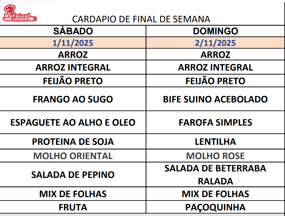 Cardápio da semana CARDÁPIO FINAL DE SEMANA ATUALIZADO (01/11/25 e 02/11/25) CARDÁPIO SEMANAL (03/11/25 – 09/11/25)